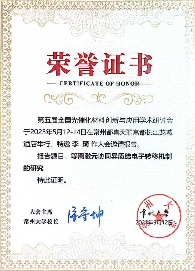 2023年5月12-14日,第五届全国光催化材料创新与应用学术研讨会在江苏省常州市举办。主办单位为常州大学、材库在线(北京)材料技术研究中心和中国化工学会化工新材料专业委员会。英国正版365博士生李琦同学作会议特邀报告,报告为:等离激元协同异质结电子转移机制增强光催化析氢的研究。