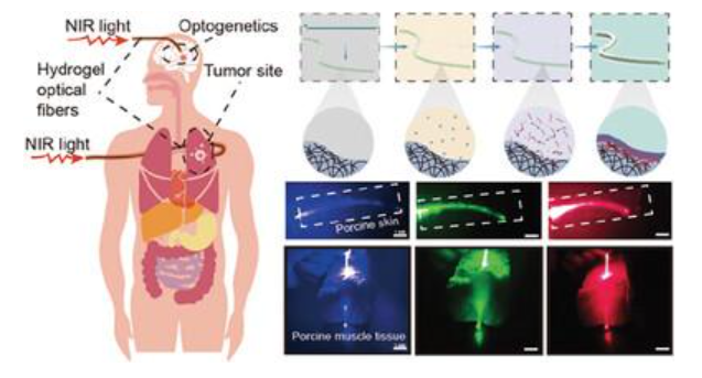 与传统的SiO 2基刚性光纤相比,水凝胶基光波导由于其优异的生物相容性和组织样模量而在光遗传学、植入式光医学和生物传感器领域引起了广泛关注。然而,现有的基于海藻酸盐的水凝胶光纤的离子诱导超分子组装由于机械性能差且伴有溶胀,通常缺乏长期稳定性。本文开发了一种基于氧化还原反应机理的新型催化表面聚合方法,通过使用替代氢键聚( N-丙烯酰甘氨酰胺)(PNAGA)水凝胶。所得的具有芯-包层异质结构的水凝胶光纤可以达到理想的全反射条件,从而具有良好的光传输和低光损耗。具有坚固的氢键网络的 PNAGA 包层赋予水凝胶光纤在潮湿环境中具有高稳定性和出色的润滑性。更重要的是,水凝胶光纤具有良好的类组织机械性能和优异的生物相容性,与传统玻璃光纤相比,在生物医学应用中显示出巨大的优势上述成果以题为“Slippery Core-Sheath Hydrogel Optical Fiber Built by Catalytically Triggered Interface Radical Polymerization”(将拓宽植入式水凝胶光纤在材料设计和结构可加工性方面的应用,促进基于水凝胶的光纤在各种应用中的使用,文章DOI: 10.1002/adfm.202309795)发表在《Advanced Functional Materials》。