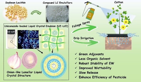 研发绿色高效的农药剂型对农业可持续发展具有重要意义。然而,目前常规水乳剂型(EWs)在复杂使用环境下稳定性差,农药活性成分突释,助剂对植物存在药害及潜在生态毒性等。针对上述瓶颈问题,该团队使用大豆磷脂基的绿色助剂,构建了具有“类洋葱”仿生结构的微纳层状液晶烯效唑液晶乳液(UZ-LCE)。结果表明,UZ-LCE具有近乎100%的载药效率,与市面上现存的悬浮剂和可湿粉剂型相比具有长效缓释性(125 h)以及较小的生物毒性,“类洋葱”的仿生结构具有多层限域和屏障作用,从而提高了水乳剂在复杂环境下(酸碱、离子、高/低温、剪切)的稳定性和长效缓释性,同时,大豆磷脂基作为一种绿色助剂,具有较高的表面活性,在低助剂含量(6×10-4wt.%)下可显著降低水的表面张力至26 mN/m,提高药液润湿展着、增强靶沉积效率。基于上述优点,LCE不仅适用于常规叶面喷施,而且可以通过滴灌随水肥递释(图1)。棉花大田实验证明,LCE对植物生长调节剂烯效唑(UZ)具有显著的增效性。UZ-LCE在控制棉花株高、增加叶绿素含量、促进花芽、棉铃形成、降低药害等方面优于商品化UZ制剂,棉花增产8.3%。“类洋葱”仿生载体为构建安全高效EWs提供了一种配方绿色、制备方法简单、可量化,多功能协同增效的创新策略,有望扩展到其他农药EWs的创制方法中。