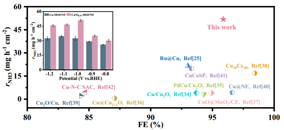 相关工作以“Copper–nickel–MOF/nickel foam catalysts grown in situ for efficient electrochemical nitrate reduction to ammonia(DOI:10.1016/j.jhazmat.2024.136036)”为题,在《Journal of Hazardous Materials》(中科院1区TOP,影响因子12.2)发表。论文的第一作者为英国正版365研究生杨晨霞、唐赢和杨茜,通讯作者是王刚、王宗元和于锋。