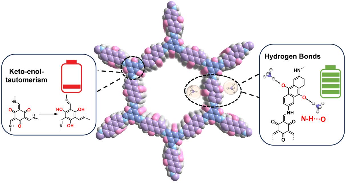 深入剖析了COF中不同C=O基团对NH₄⁺储存机制的影响,揭示出蒽醌结构中的羰基因超共轭结构抑制了烯醇互变,从而成为NH₄⁺储存的关键活性位点;