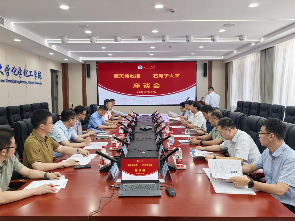 随后,谭天伟院士一行在逸夫实验楼225会议室出席了化工学科发展交流座谈会。会议由党委书记贾鑫主持。石河子大学党委常委、副校长李剑代表学校对谭院士一行表示热烈欢迎,并简要介绍了学校基本情况、科技创新工作及化工一流学科建设成果。他提到,石河子大学化学工程与技术学科两次入选国家“双一流”建设学科,近年来在科研平台建设、项目承担及成果转化方面成效显著。院长刘纪昌详细汇报了化工学科发展现状与未来规划,展示了学院在能源化工、绿色化工等领域的特色成果。