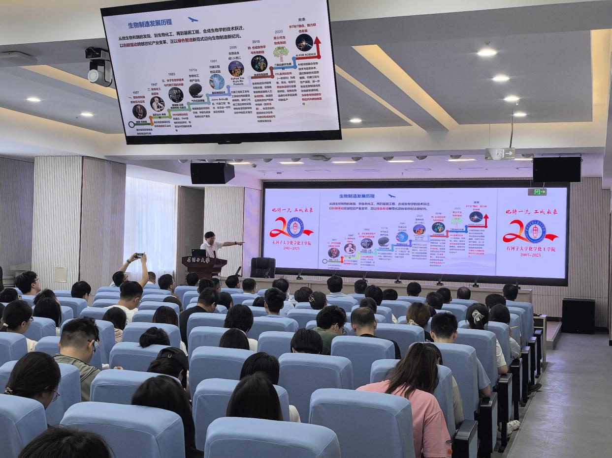 在院史馆,谭院士一行详细了解了学院发展历程、学科建设及人才培养成果,对学院在化工领域的深厚积淀表示赞赏。随后,专家组参观了化工绿色过程兵团重点实验室,听取了实验室在乙炔化工、生物质催化转化等领域的研究进展汇报。谭院士充分肯定了实验室的科研实力,并就技术攻关、成果转化等提出指导建议。之后,谭院士在化工创新楼201学术报告厅为全院师生作了题为《发展生物制造助力新质生产力》的学术报告。报告聚焦生物化工前沿技术,从微生物与酶的发现,到生物化工发展,再到基因工程、合成生物学的技术跃迁,重点介绍了生物制造发展历程及其在推动新质生产力中的重要作用。