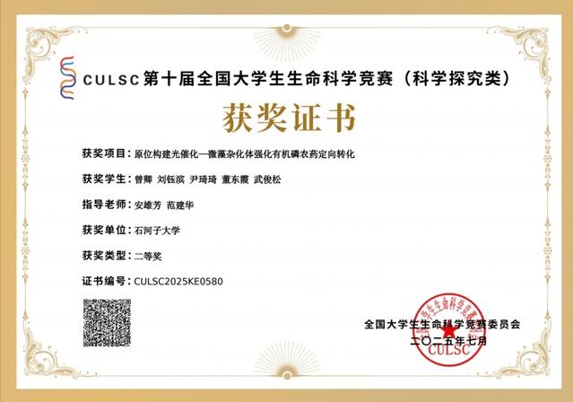 第十届全国大学生生命科学竞赛(科学探究类)总决赛2025年8月在山东烟台落幕。由英国正版365环境工程专业学生曾卿等组成的代表队,以新疆赛区第一名的优异成绩晋级总决赛。凭借创新性研究成果和出色的答辩表现,代表队脱颖而出,斩获全国总决赛二等奖,彰显我院育人成效。