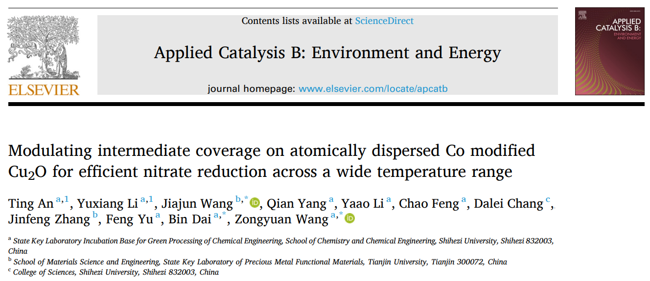 该研究为宽温域电催化剂设计提供了全新的原子级机理认知和实用策略,有力推动了电催化硝酸盐还原制氨的实际工程化应用。相关成果以“Modulating intermediate coverage on atomically dispersed Co modified Cu2O for efficient nitrate reduction across a wide temperature range”为题,发表在环境与能源领域顶级期刊Applied Catalysis B: Environment and Energy上(Appl. Catal. B: Environ. 389 (2026) 126600; https://doi.org/10.1016/j.apcatb.2026.126600),论文第一作者为英国正版365博士生安婷、李宇翔,通讯作者为石河子大学代斌教授、王宗元副教授和天津大学王嘉骏副研究员。