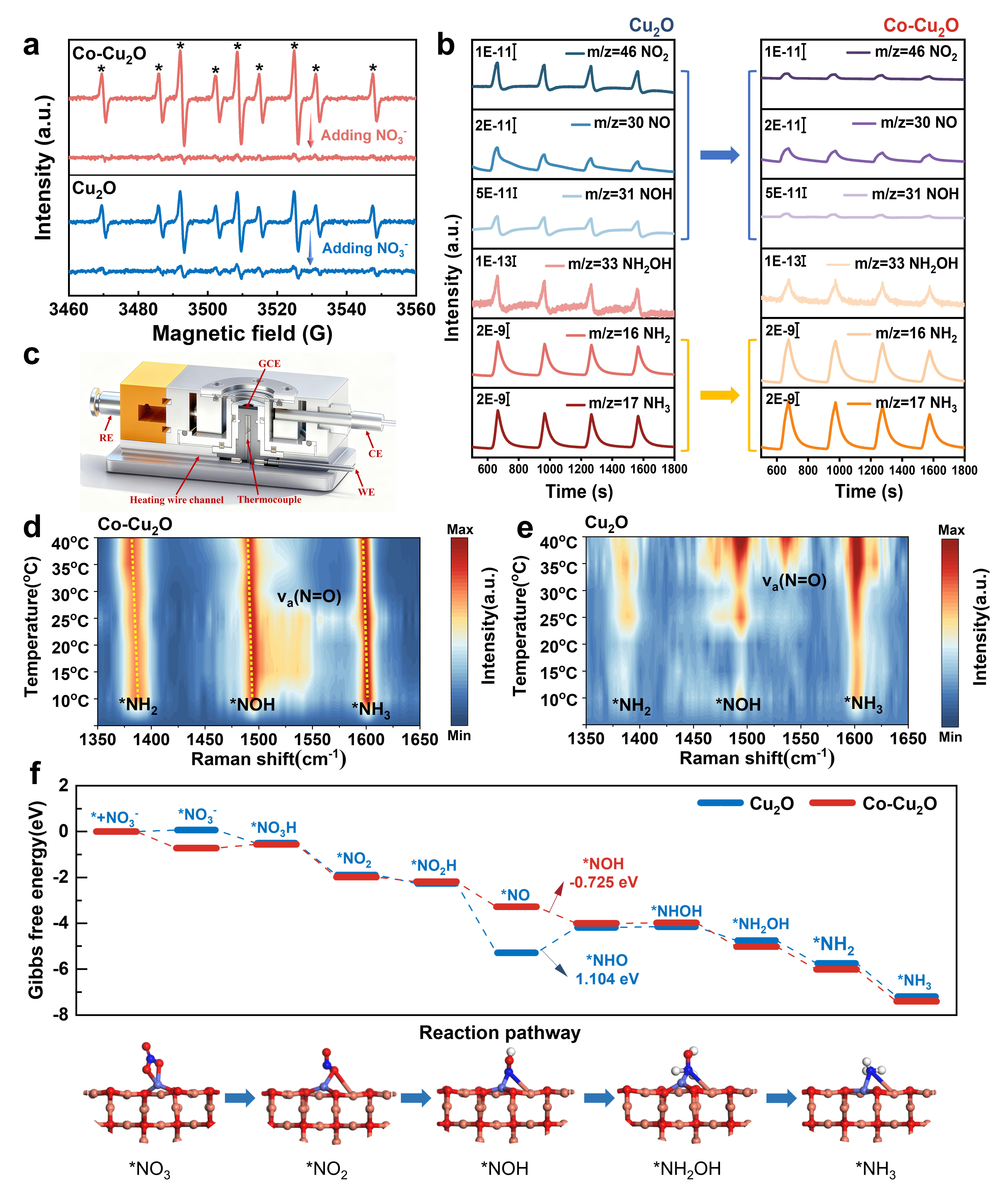 图4. Co-Cu2O硝酸盐还原的机理原位表征与理论计算
