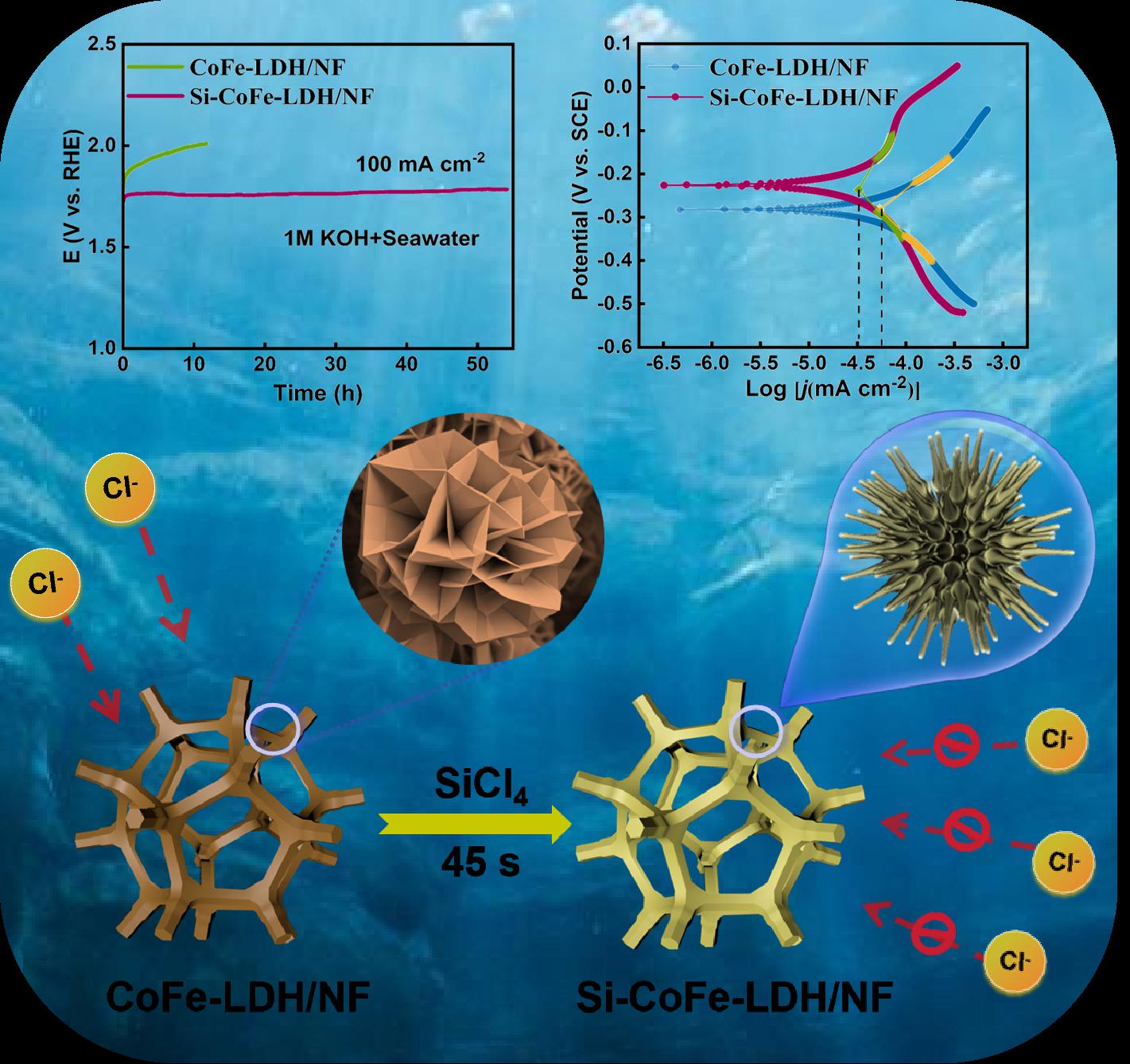 (1)基于工业副产物四氯化硅的回收利用,设计并制备了一种海胆状Si-CoFe-LDH/NF材料,将其作为海水电解中高效且耐氯腐蚀的阳极OER催化剂。不仅实现了工业副产物的高附加值转化,同时为催化剂制备提供了新颖的硅源掺杂路径,达到了“变废为宝”的双重效益。
