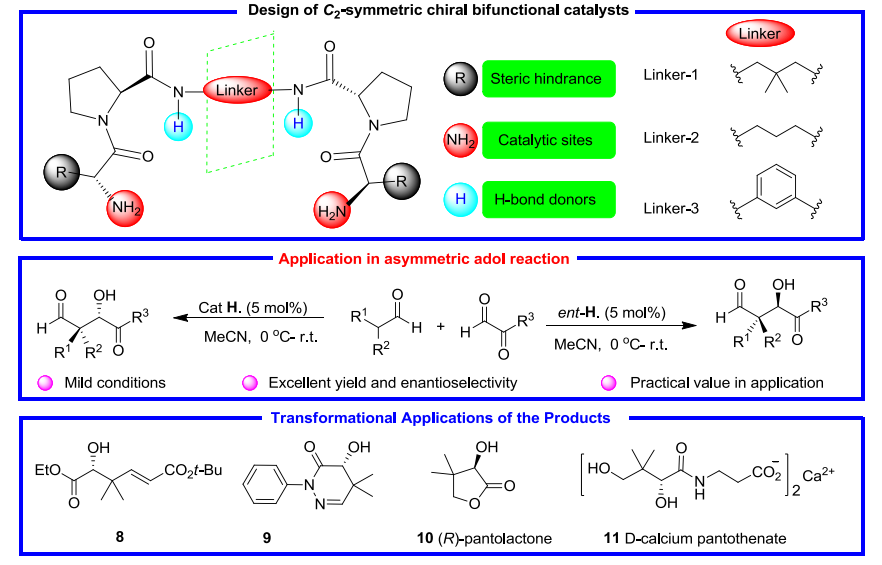 本文聚焦于新型C₂-对称手性双功能伯胺催化剂的设计、合成与其在不对称催化中的应用。作者以1,3-二胺为连接臂、Tle-DPro为催化活性单元,通过高效的酰胺缩合反应制备了目标催化剂,并将其应用于脂肪醛与α-羰基醛的不对称Aldol反应。在乙腈、0℃至室温的反应条件下,高效合成了一系列含手性季碳中心的1,4-二羰基化合物,产率高达99%,对映选择性(ee值)高达99%。相比于传统的仲胺催化剂,该伯胺催化体系对α-支链醛、直链醛、α-羰基醛均具有优异底物适用性。所得产物可进一步转化为(R)-泛内酯、D-泛酸钙、手性哒嗪酮、α,β-不饱和酯等高附加值药物与精细化工中间体,其中(R)-泛内酯是维生素B5与辅酶A的关键合成前体。团队还通过高分辨质谱(HR-MS)、核磁共振表征及动力学研究,阐明该反应主要以双烯胺路径进行,并明确了催化剂结构与性能之间的构效关系。