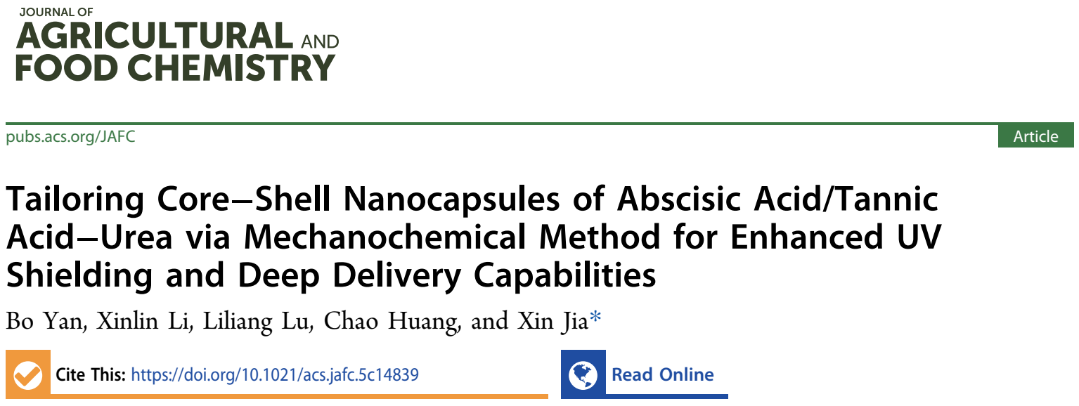 文章信息:Tailoring Core-Shell Nanocapsules of Abscisic Acid/Tannic Acid−Urea via Mechanochemical Method for Enhanced UV Shielding and Deep Delivery Capabilities. Bo Yan, Xinlin Li, Liliang Lu, Chao Huang, Xin Jia*. Journal of Agricultural and Food Chemistry, 2026, 10.1021/acs.jafc.5c14839.