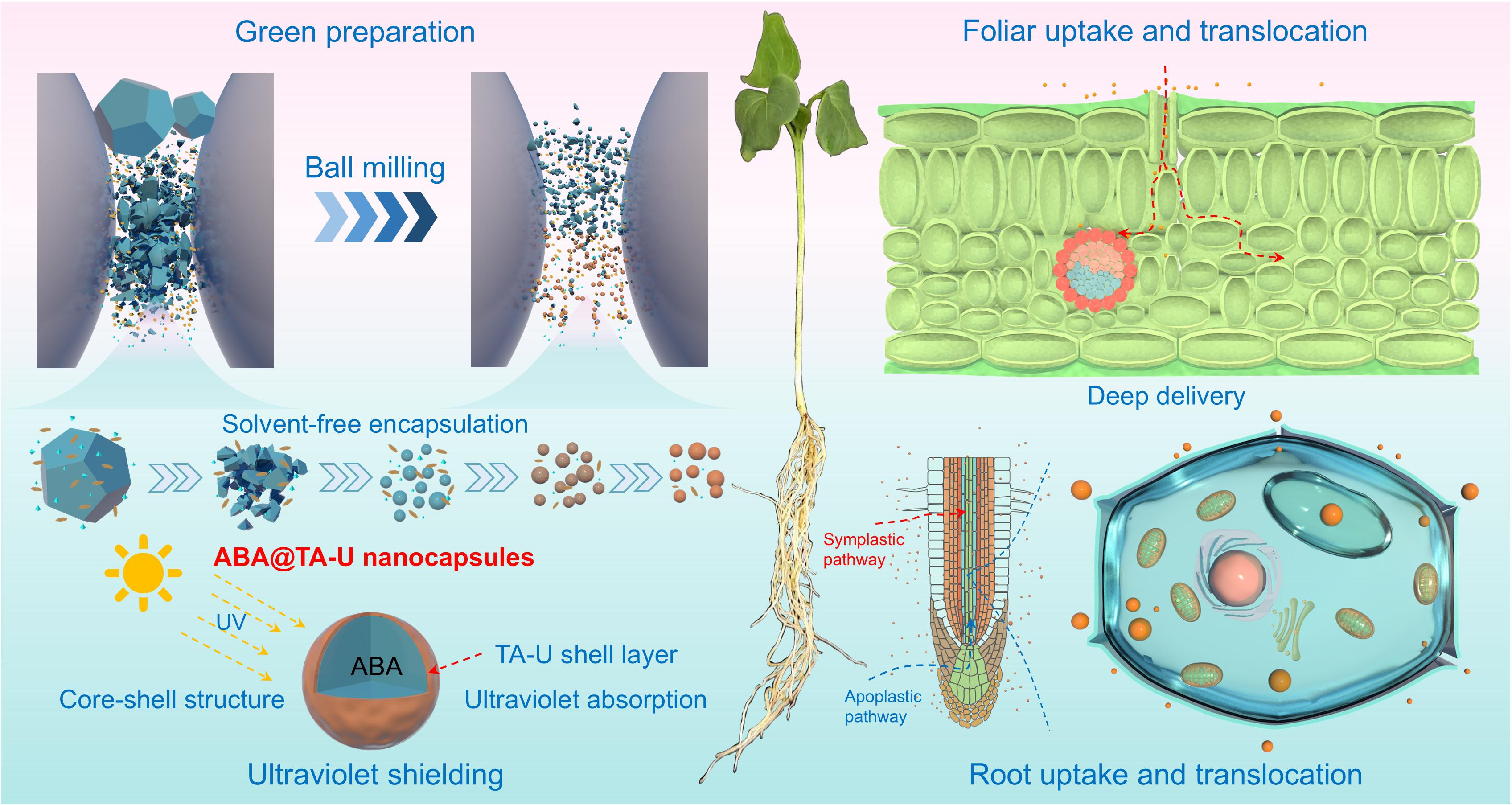 针对上述问题,该团队利用机械力化学法成功构建了一种以脱落酸(ABA)为芯材、单宁酸(TA)-尿素(U)为壳材的核壳纳米胶囊递送系统(ABA@TA-U),以增强紫外屏蔽性能。得益于无溶剂合成策略,所制备的ABA@TA-U-6纳米胶囊具有较宽的粒径分布,活性成分负载率高达77.7%。TA-U外壳赋予材料优异的紫外屏蔽性能,显著抑制了ABA的光降解。叶面喷施与水培实验结果表明,ABA@TA-U-6纳米胶囊能够被棉花幼苗的叶片和根系有效吸收并实现体内转运。蛋白质组学分析进一步证实,该纳米胶囊可激活MAPK信号通路及相关代谢过程,从而触发植物的系统抗逆防御反应。综上所述,ABA@TA-U-6纳米胶囊系统不仅有效保护ABA免受紫外降解,还为胞内农药递送提供了高效平台,展现出在可持续农业中的广阔应用前景。